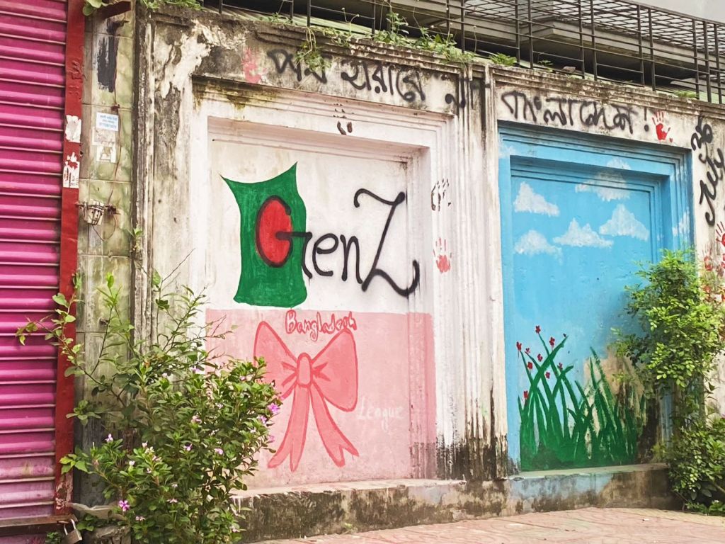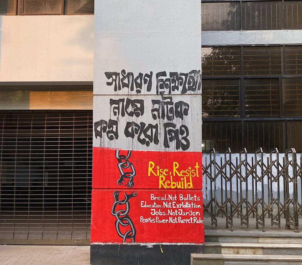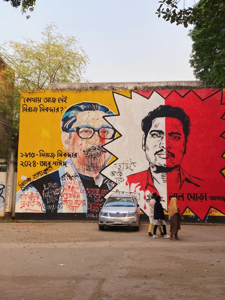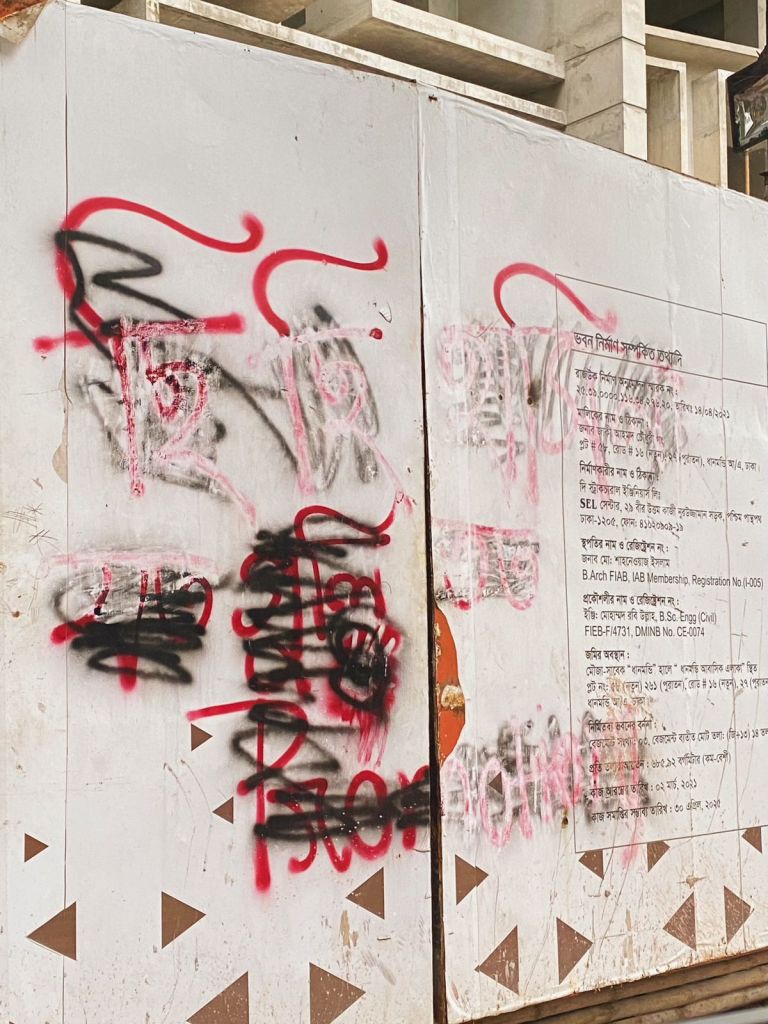 Some of them, like the one above, depict the persistent resistance of the overthrown party. The writing on the wall is one of the famous slogans during the uprising “Chi chi Hasina,” which translates to “shame on Hasina”. This writing can be seen all over the streets of Dhaka. But this particular graffiti seems to have been removed with black and white paint.